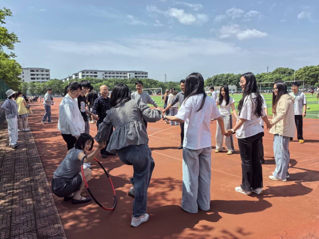 活动项目丰富,亮点十足。“一圈到底”中,同学们手拉手围成圈,传递呼啦圈,展现出绝佳默契,期间有人动作滑稽,引得众人捧腹大笑。板鞋竞速环节,大家脚穿板鞋,齐声喊着口号,步伐一致向前冲,彰显团结精神。投壶区域,同学们身姿优雅,专注投箭,投中时欢呼雀跃,场面热闹非凡。合力建塔考验团队协作,大家分工明确,小心翼翼搭建积木,力求搭建得又高又稳 。