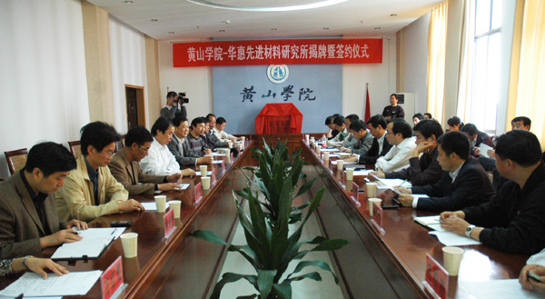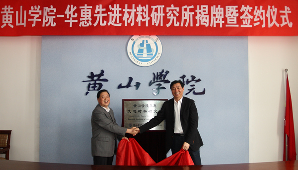 5月14日下午,365英国上市官方网站华惠先进材料研究所揭牌仪式在逸夫图书馆三楼会议室举行。365英国上市官方网站华惠先进材料研究所是由365英国上市官方网站和黄山永佳集团黄山华惠精细化工有限公司联合创办无独立法人资格的产学研合作机构。研究所设在365英国上市官方网站,依托365英国上市官方网站应用化学研究所。365英国上市官方网站提供实验室基地和基本的实验条件,黄山华惠精细化工有限公司提供研究所启动资金10万元,合作内容包括项目开发和人才培养。