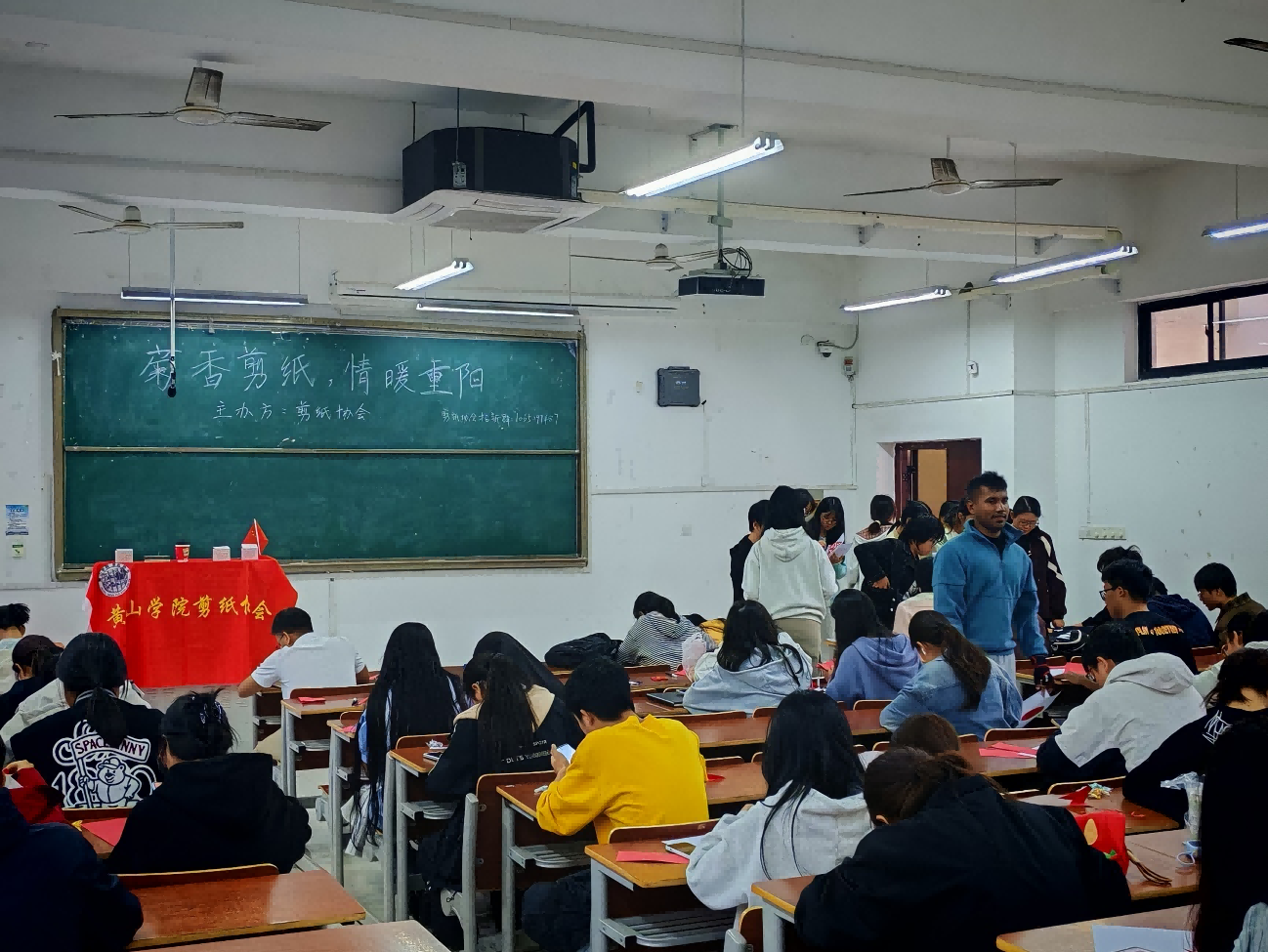 岁岁重阳,今又重阳。在重阳节这一承载着敬老思亲与传统文化意蕴的节日里,11月2日下午,剪纸协会在率水校区文端楼2206教室、横江校区1401教室开展“菊香剪纸,情暖重阳”主题创作活动。活动不仅吸引了众多同学参与,更迎来了广泛留学生的热情关注,现场以剪刀为笔、红纸为媒,在指尖流转间感受中华传统节日的独特魅力。