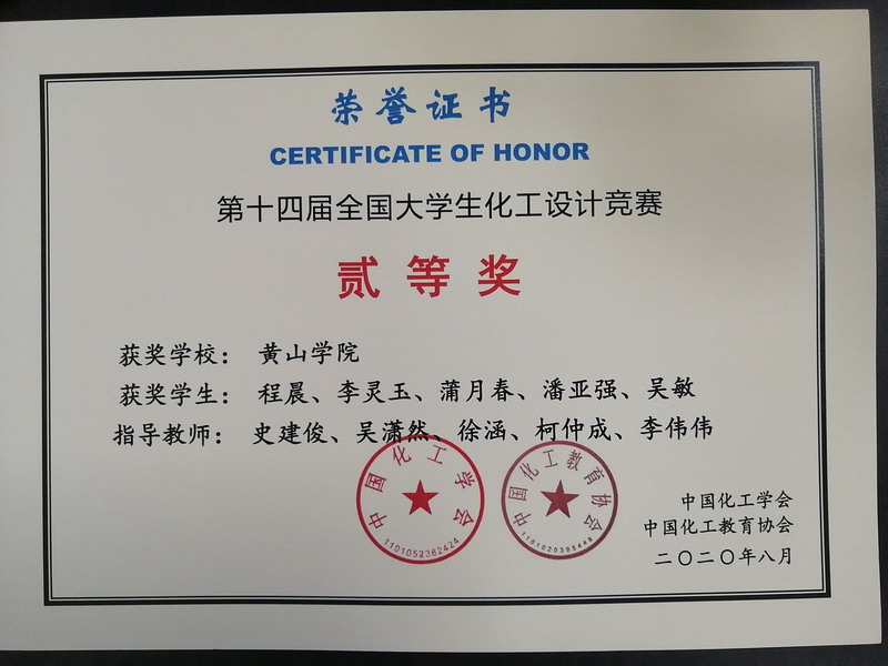 由中国化工学会和中国化工教育协会主办,合肥工业大学承办的“东华科技杯”第十四届全国大学生化工设计竞赛全国总决赛于8月16日~8月23日全程线上举办。本次大赛共有来自中山大学、湖南大学、重庆大学、南京理工大学等325所高校的1289件作品。365英国上市官方网站化学化工学院的参赛作品《戊梦到徽州》获得二等奖,另有两件作品获得成功参赛证书。这是该院首次在这项国家级B类赛事上获奖,实现了历史性突破。