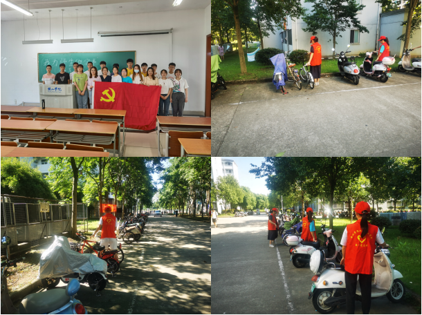 本次活动分为四组分别前往逸夫综合楼、逸夫图书馆、7栋和21栋,将每栋楼前停放不规范的自行车和电动车摆放整齐,通过大家的认真摆放,使楼前停放的自行车和电动车整齐有序的摆放在停车位中。