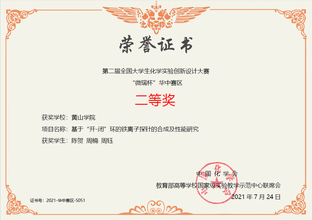 在中国化学会、教育部高等学校国家级实验教学示范中心联席会主办,武汉大学承办的第二届“微瑞杯”全国大学生化学实验创新设计大赛华中赛区赛中,我院选手陈贺、周钰、周楠获得新创组二等奖的好成绩。本次竞赛设初赛和复赛两个环节。初赛共有来自安徽、河南、湖北、江西四个省份69所高校164支队伍参加。参赛选手根据竞赛章程,从新创实验、改进实验、科普实验三个赛道提交相应作品、视频及相关支撑材料。第一轮函评后,共遴选出50所高校80支队伍进入复赛进行现场答辩。