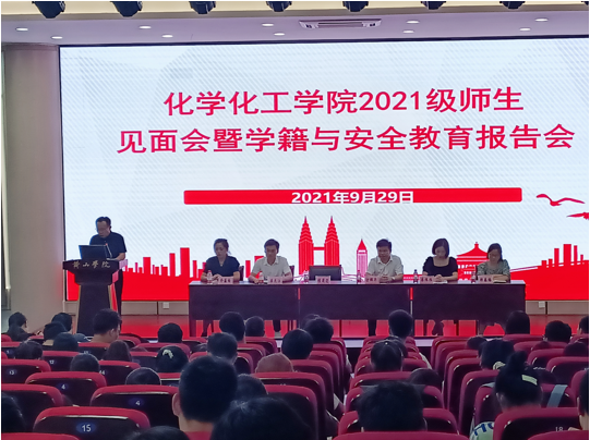 9月29日,化学化工学院于文端楼二楼报告厅召开2021级师生见面会暨学籍与安全教育报告会,学院领导班子成员、行政管理人员、全体教研室主任、专职辅导员及全体新生参加会议,大会由副院长李长江主持。
