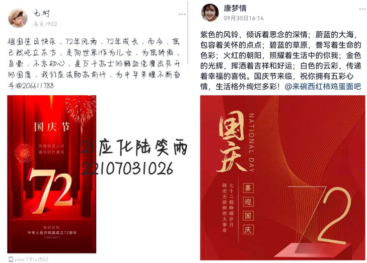 为丰富假期校园生活,营造校园喜迎国庆的和谐氛围,庆祝祖国72岁华诞,化学化工学院于10月1日至10月3日期间开展了“迎祖国华诞,中华儿女献祝福”线上主题庆祝活动。