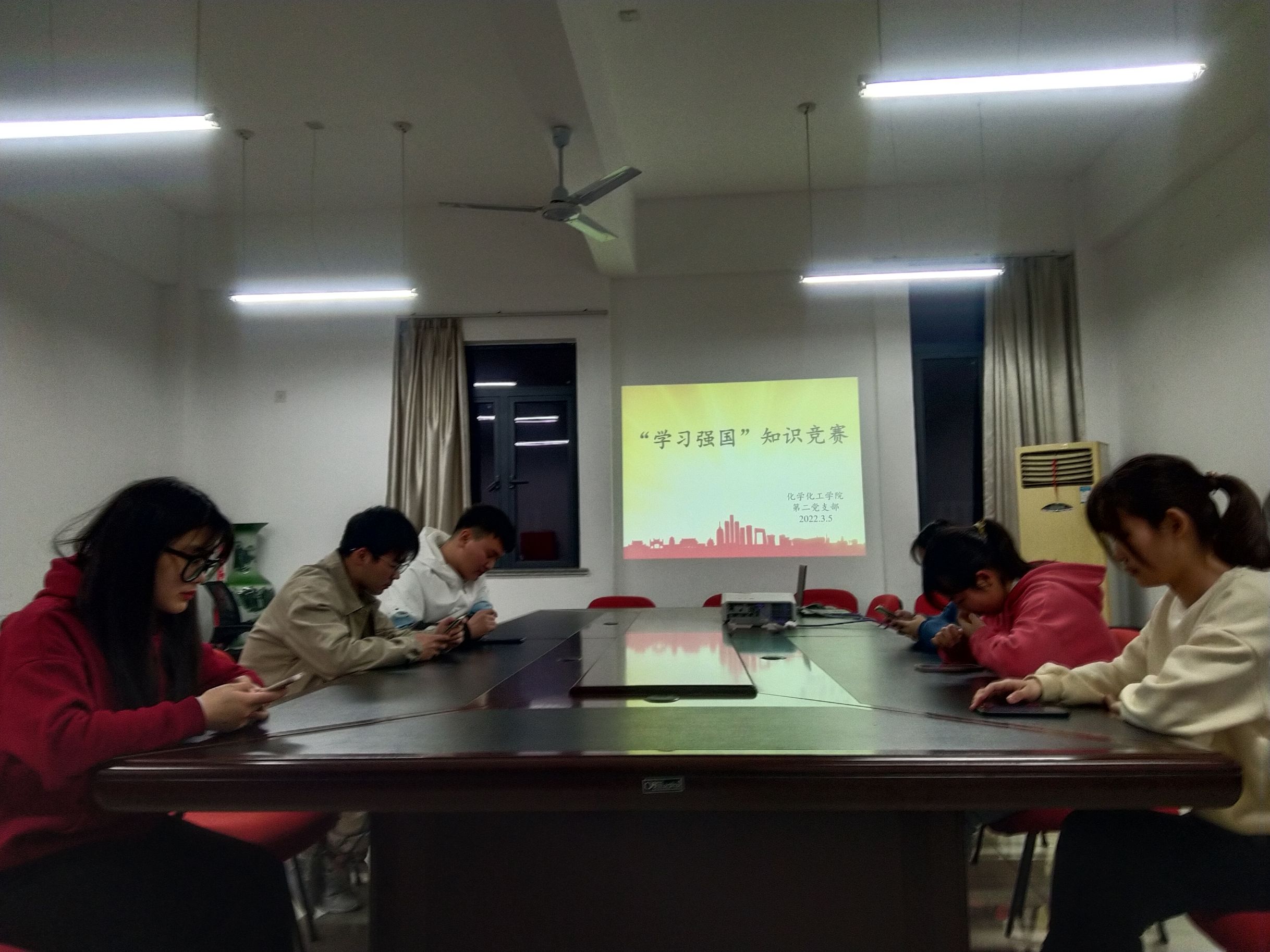 为进一步巩固党史学习教育成果,深入推动支部党员用好“学习强国”平台,激发全体党员学习热情,2022年3月5日,化学化工学院第二党支部于学院党员活动室举办“学习强国知识竞赛”主题党日活动,支部全体党员参加。