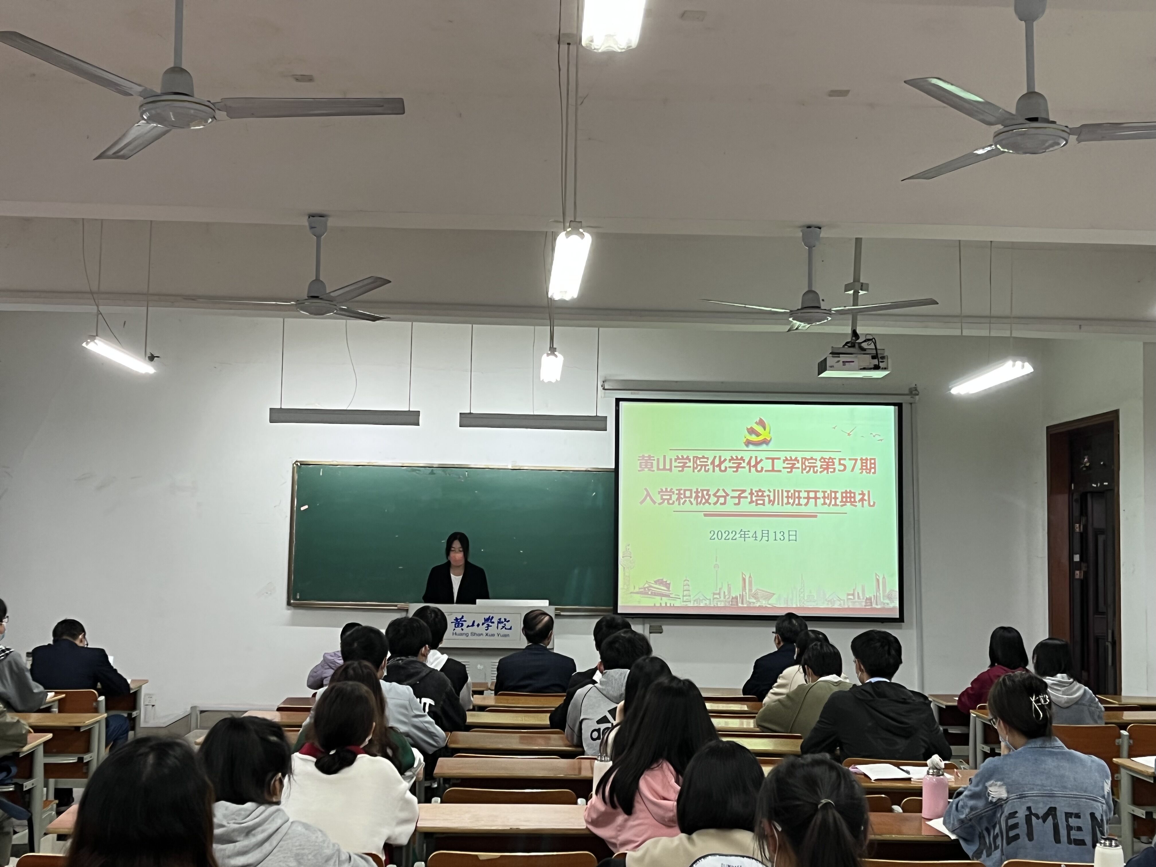 为更好的加深入党积极分子对党的认识,端正入党动机,化学化工学院于逸夫综合楼5106教室举行57期入党积极分子培训班开班典礼。校党委组织部副部长张爱民、化学化工学院党委书记程周旺、学院各党支部书记、党校的管理老师及57期培训班全体学员参加本次开班典礼,叶双峰主持开班典礼。