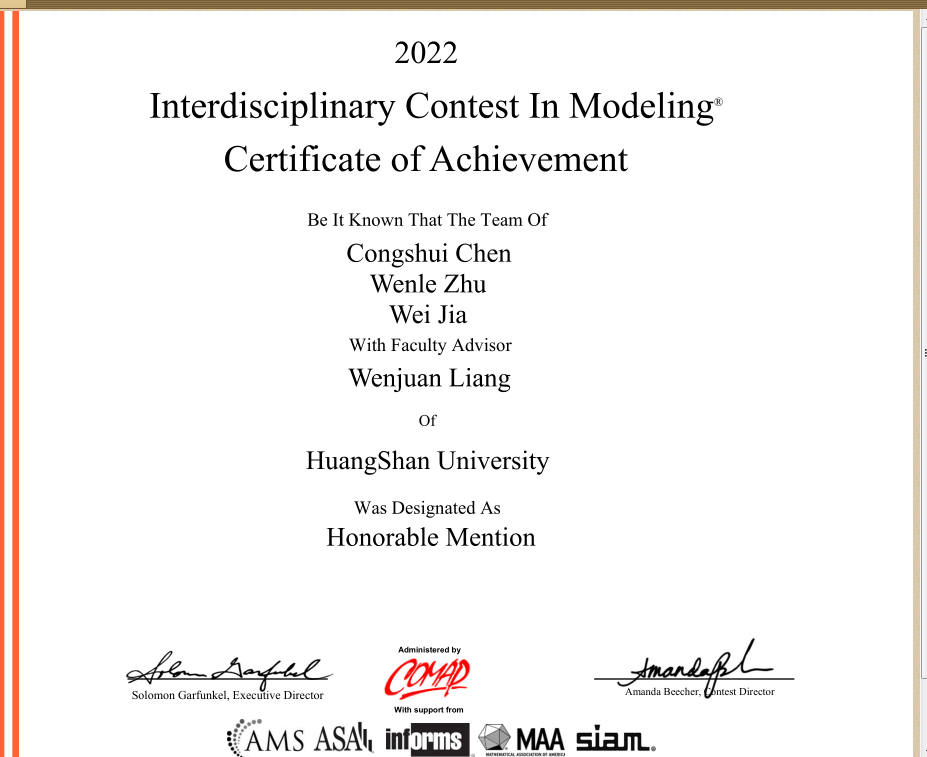 美国大学生数学建模竞赛由美国数学学会、美国工业与应用数学学会举办,是唯一的国际性数学建模竞赛,也是世界范围内最具影响力的数学建模竞赛。继2021年获得“2021年全国大学生数学建模竞赛”二等奖后,在学校的大力支持和数统学院老师的指导下,陈丛水和朱文乐积极备战2022年美国大学生数学建模竞赛。他们十分珍惜参赛机会,勤奋钻研,通力协作,把平时学习积累的专业知识运用到比赛准备中。在比赛中,他们较好地展示出了创新精神、抽象思维能力、数字应用能力、写作能力、合作能力以及跨学科思维和知识储备。