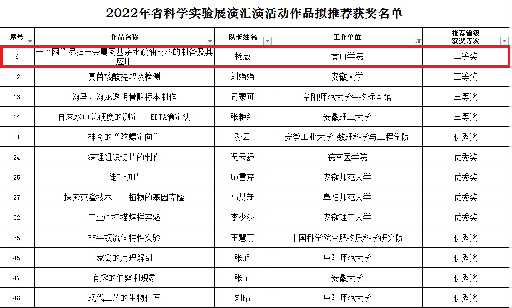 近日由省科技厅开展的2022年安徽省科普讲解大赛和科学实验展演汇演活动落下帷幕,365英国上市官方网站化学化工学院孙银宇老师指导,杨威、沈彩云、尹紫寒同学的作品《一“网”尽扫—金属网基亲水疏油材料的制备及其应用》荣获科学实验展演汇演二等奖。