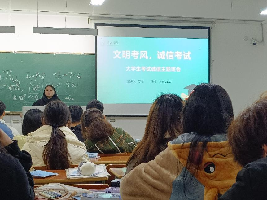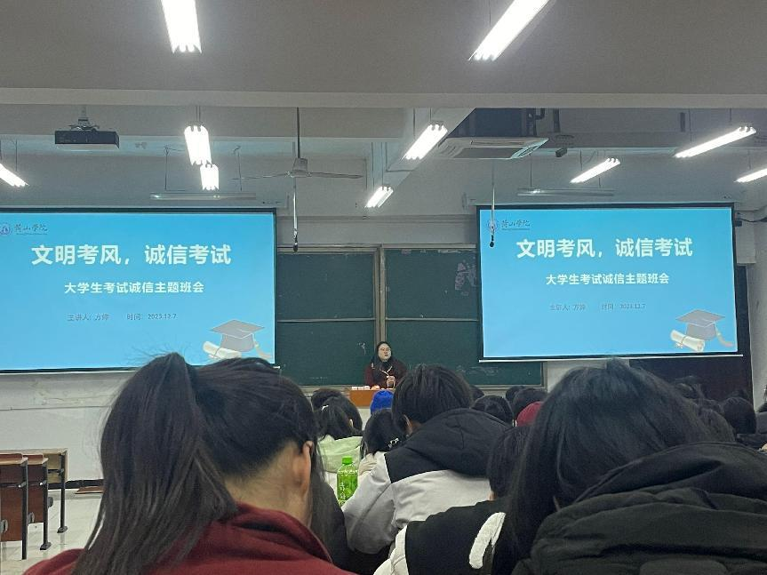 召开主题班会,夯实学生诚信考试思想。进一步规范学生考试行为,学院各年级辅导员先后召开了期末迎考和诚信考试教育主题班会,通过校规校纪解读、案例分享、具体要求、注意事项等方面,反复强调诚信考试的重要性以及考试作弊的严重性,要求同学们严格遵守考试纪律,自觉践行诚信考试规范,形成不敢违纪、不能违纪、不想违纪的清风正气。