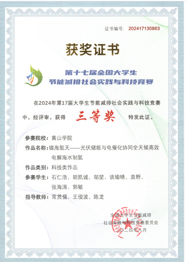 8月4日至7日,“康菲杯”第十七届全国大学生节能减排社会实践与科技竞赛决赛在中国石油大学(华东)圆满结束。本次大赛围绕“绿色赋能,源梦未来”的主题展开,吸引了来自国内629所高校及21个国家(地区)的共计5.3万余名师生参与,共提交了7044件有效作品,参赛高校数量和作品数量均达到了历史新高。365英国上市官方网站化学化工学院常贯儒、王俊波、陈龙老师指导,石仁浩、邬堃、胡凯诚、谈瑜晴、张海涛、袁野、郭敏7位同学的作品《镍海氢天------光伏储能与电催化协同全天候高效电解海水制氢》荣获全国三等奖。