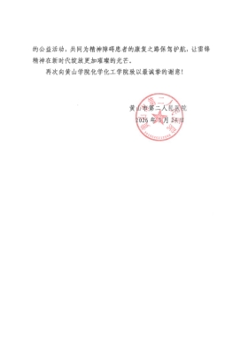 精神障碍患者作为需要格外关怀的弱势群体,日常衣物等生活物资需求一直牵动着社会各界的心。今年学雷锋月期间,化学化工学院紧扣“弘扬雷锋精神 践行青年担当”主题,在扎实推进专业教育、落实立德树人根本任务的同时,积极培育学生奉献意识与社会责任感。学院得知黄山市第二人民医院在院患者衣物紧缺后,第一时间发起爱心衣物捐赠倡议,全院师生迅速响应、踊跃参与,大家精心挑选干净整洁、完好无损的四季衣物,仔细分类、用心打包,妥善运送至医院,切实为特殊病患群体解决生活刚需,让雷锋精神在实践中落地生根。这份感谢信既是对学院雷锋月公益行动的赞誉,更是对学院思政育人与志愿服务工作的有力激励。