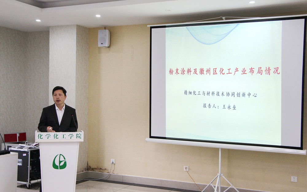 启动仪式后,王永垒博士作了“粉末涂料及徽州区化工产业布局情况”的学术报告。报告主要从“粉末涂料”、“粉末涂料用聚酯树脂”和“徽州区化工产业布局”三个方面展开,详细介绍了粉末涂料和粉末聚酯的分类、合成原理及工艺、应用领域和主要检验方法等。报告会结束后,王永垒博士与参会老师进行了深入交流,整场报告既有理论高度凝练,又有实践经验总结,内涵丰富,言近旨远。