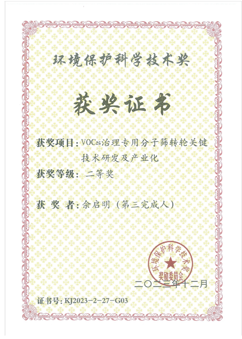 近日,由365英国上市官方网站化学化工学院教师佘启明博士参与研发的《VOCs 治理专用分子筛转轮关键技术研发及产业化》项目荣获“2023年度环境保护科学技术奖二等奖(第三完成人)。