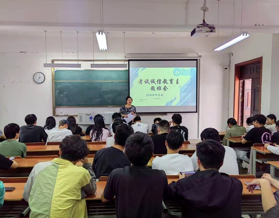 为加强考风考纪,深化诚信理念,培养大学生的诚信意识,营造“诚信、文明、公平”的考试氛围。2024年5月30日22材料科学与工程专业开展了“文明考风,诚信考试”诚信教育主题班会。班会由辅导员吴甜甜老师主持,全体同学参加。