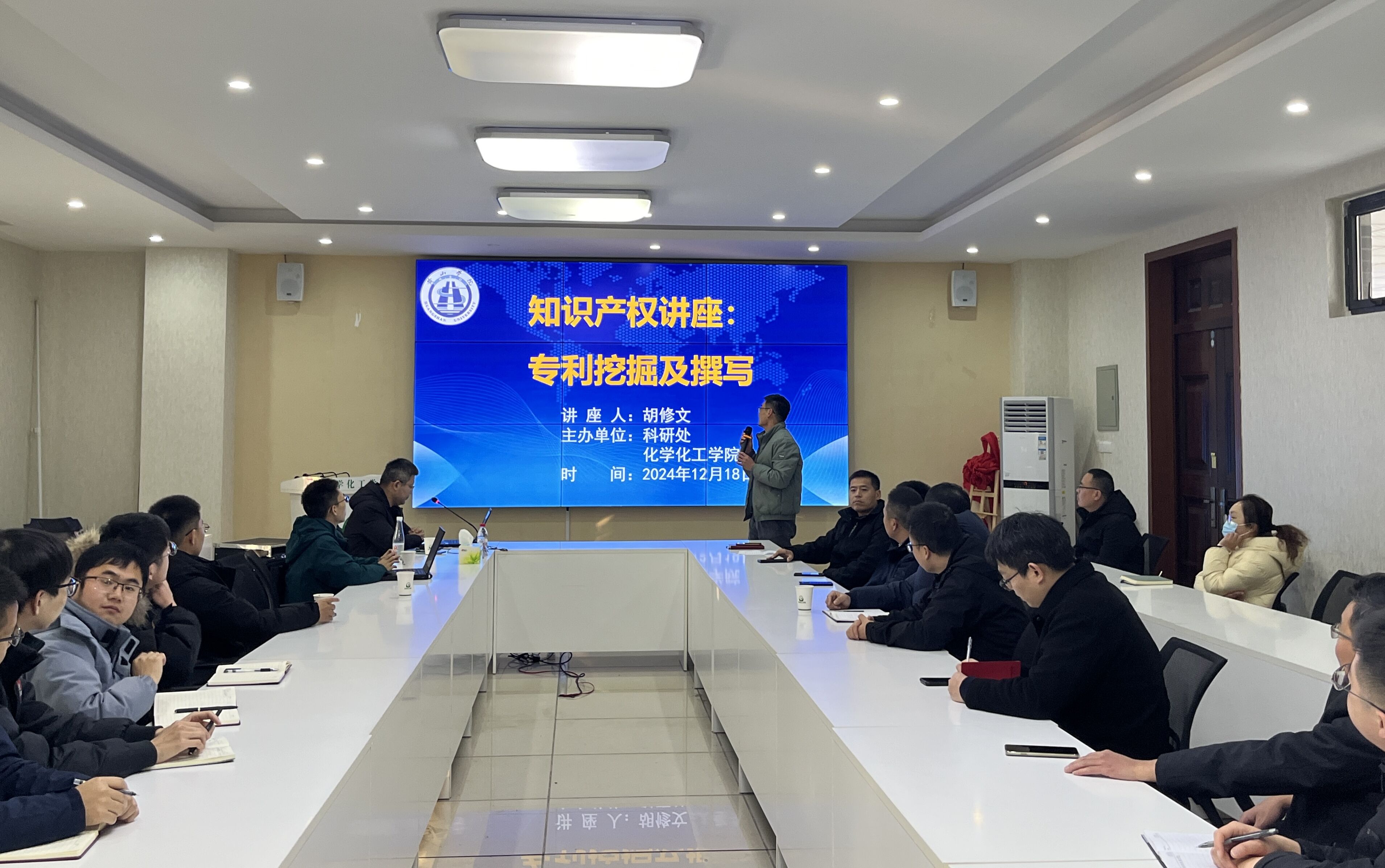 2024年12月18日下午,由科研处和化学化工学院联合举办的知识产权讲座“专利挖掘及撰写”在逸夫综合楼5316会议室举行。主讲人北京智桥联合知识产权代理事务所胡修文总经理。讲座由化学化工学院院长李长江主持。