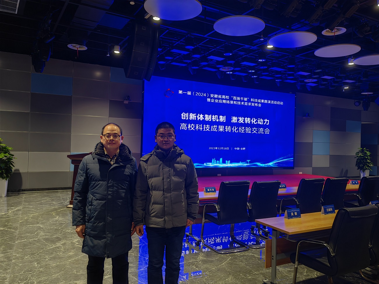 2024年12月18日,第一届安徽省高校“百场千项”科技成果路演活动启动仪式暨企业应用场景和技术需求发布会在安徽创新馆举办,化学化工学院黄飞博士和孙光映博士参加该活动。